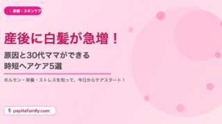 産後に白髪が急増したと悩むママへ。ホルモン変化・栄養不足・ストレスなど増える原因と、忙しいママでもできる時短ヘアケア5選を紹介。毎日5分でできる方法ばかりです。