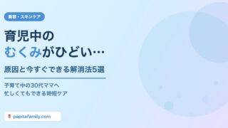 美容・スキンケア 育児中のむくみがひどい原因と30代ママでもできる解消法5選 育児中のむくみが気になるママへ。睡眠不足や授乳姿勢など、むくみが悪化する原因と、忙しいママでも今日からできる解消法を5つご紹介します。 2026.04.13 美容・スキンケア